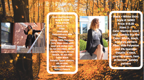 This individual project is a catalog I created based off of the photoshoot. I chose six items from the outfits and identified style numbers, price, colors, sizes, etc.